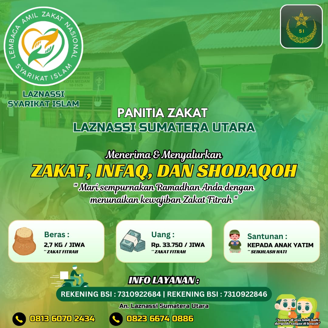 Syarikat Islam (SI) Sumatera Utara memiliki layanan zakat, sedekah, dan wakaf. LAZNAS Syarikat Islam Sumatera Utara menyalurkan infak kemanusiaan melalui BAZNAS RI.